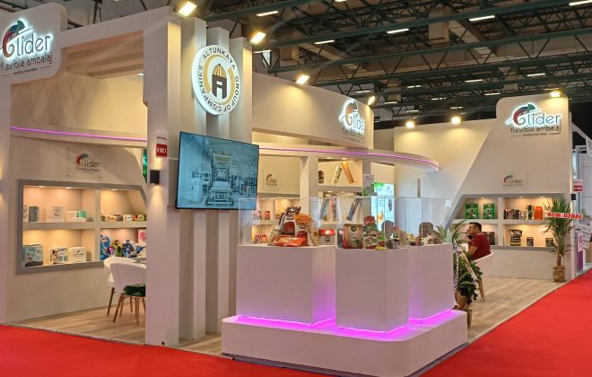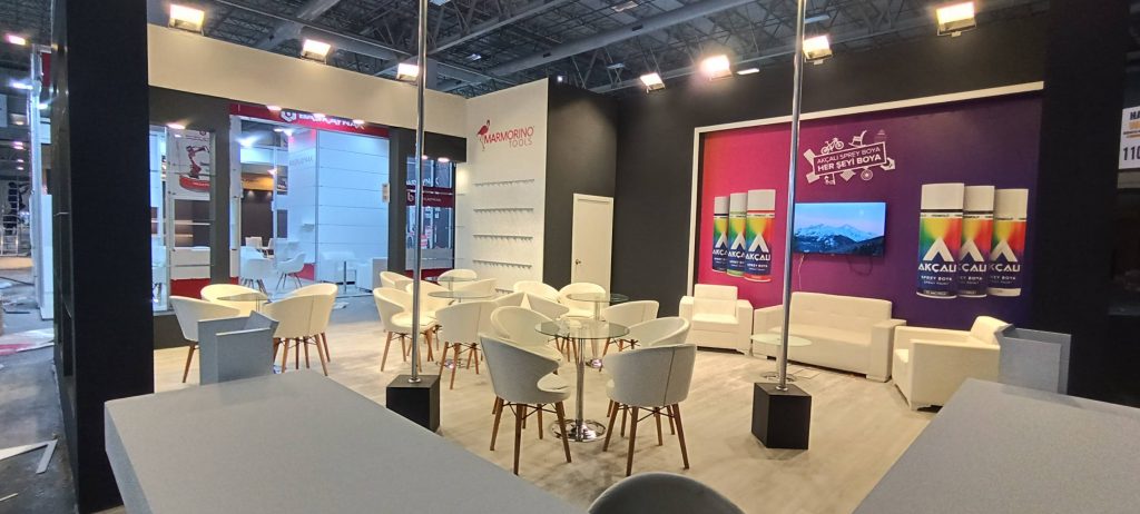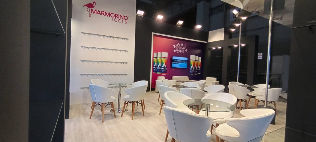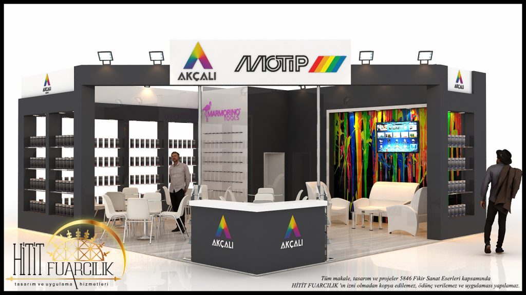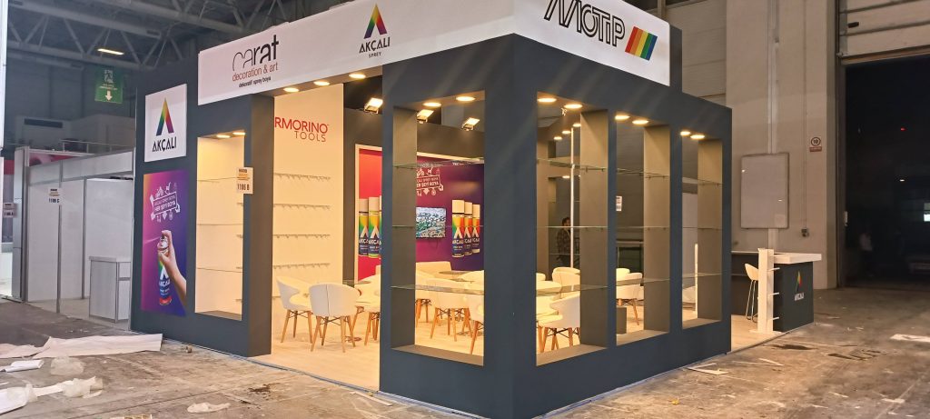 Bei diesem Messestand wurde ein Holzständer durch Auftragen von Farbe auf MDF hergestellt, das Design wurde komplett nach Kundenwunsch vorbereitet, die Böden bestanden aus Parkett und auf den Regalen wurden Glasböden verwendet.