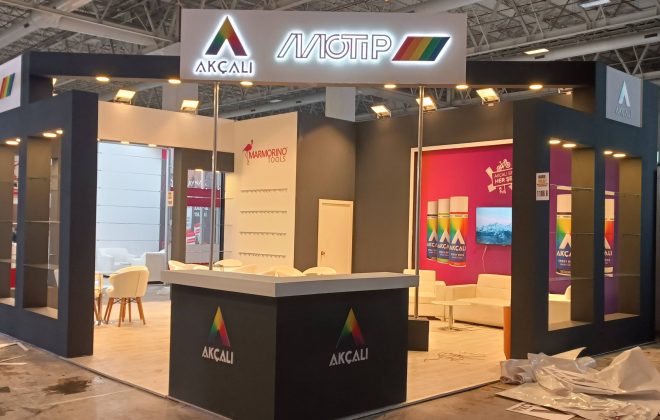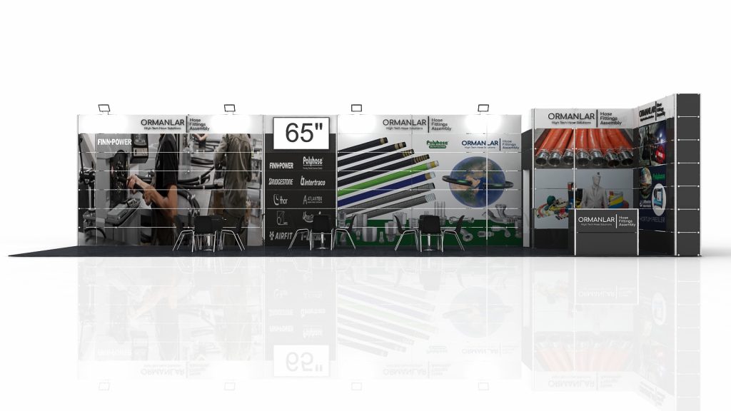 Modularer Messestand, dieser Stand wurde speziell für unser Unternehmen vorbereitet, der Boden ist mit Teppich ausgelegt, die Wände sind mit Druckverkleidung vorbereitet, die Logos sind in 3D vorbereitet,